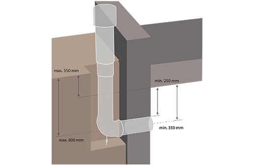 Die Kellerdurchführung ermöglicht den Einbau von dezentralen Lüftungsgeräten in Kellerräumen. Sie ist einsetzbar bis zu einem maximalen Abstand von 350 mm zwischen Kellerdecke und Oberkante Erdreich. Von Vorteil ist eine Drainage für den Kondensatablauf, die idealerweise bereits integriert sein sollte. Daneben muss ein Schacht in ausreichender Größe zur Verlegung des Steigrohres und Rohrbogens ausgehoben werden.