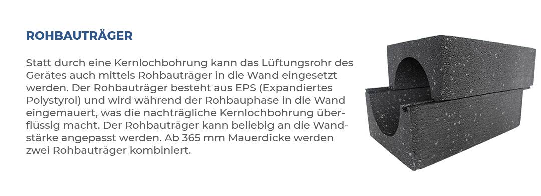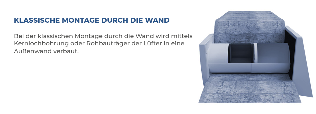 Dezentrale Lüftungsanlagen sind für den Einbau in Außenwände von Gebäuden in eine vorbereitete Öffnung in der Außenwand des Gebäudes konstruiert. Bei einem Neubau können diese Öffnungen schon bei der Planung berücksichtigt werden. Bei der Gebäudesanierung werden die Öffnungen nachträglich in die Gebäudeaußenwände gebohrt, mit der sogenannten Kernlochbohrung.