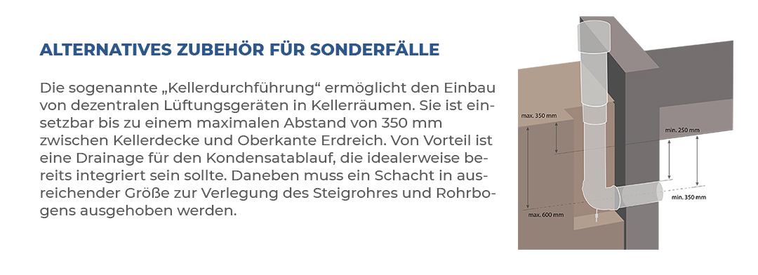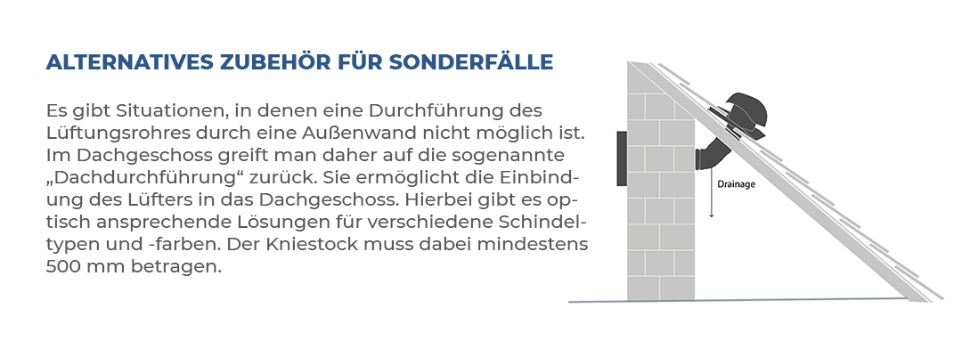 Sollte die Durchführung durch die Außenwand aufgrund von baulichen Gegebenheiten (Dach- oder Kellergeschoss) nicht möglich sein, ist alternativ eine Dachdurchführung oder Kellerdurchführung möglich.