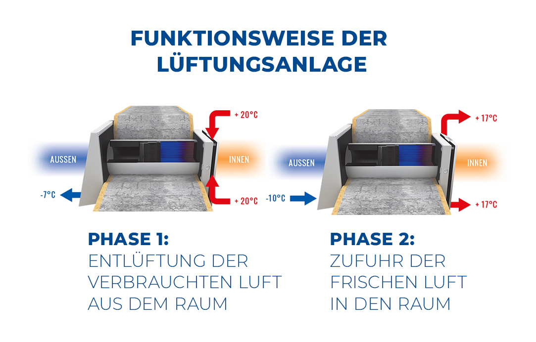 Die Angst, dass Wohnraumlüftungen die Stromrechnung in die Höhe treiben, ist bei näherem Hinsehen unbegründet. Wohnraumlüftungsanlagen sind auf maximale Effizienz ausgerichtet und arbeiten mit Wärmerückgewinnung. Die Wärme der Abluft wird zur Vorerwärmung der Frischluft genutzt. Damit ist es möglich, minus 10 Grad Celsius kalte Außenluft auf rund 17 Grad Celsius zu erwärmen, wenn sie in die 20 Grad Celsius warmen Innenräume gelangt – ganz ohne zusätzliche Energiezufuhr. Damit übersteigt die gewonnene Energie den sehr geringen Strombedarf des Ventilators. Im Gegensatz dazu gelangt bei herkömmlicher Fensterlüftung die warme Raumluft ungenutzt ins Freie. Zusätzlich dringt kalte Luft ein, die sich erst langsam und energieintensiv aufwärmt.